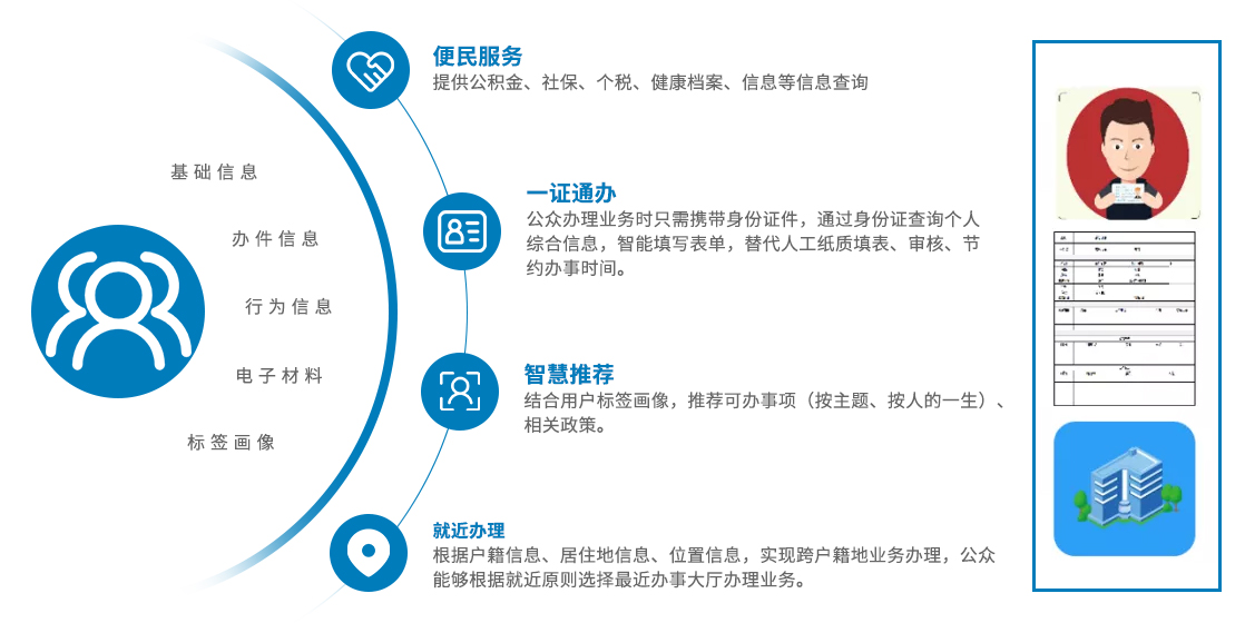 以民眾自然人、企業法人的生命周期為“指揮棒”,大數據分析獲得標簽,快速篩選到精準人群及分類,提供關聯信息及主動推送服務,增強公眾服務獲得感。如結合民眾基礎信息、辦件信息、行為信息、電子材料等形成民眾標簽畫像,按主題、按人的一生關鍵節點主動推送可辦事項、相關政策,實現無材料申報,一次錄入,全域使用,一次變更,全域變更。
